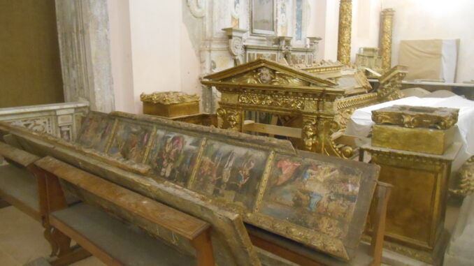 la maestosa ancona lignea in legno scolpito, dorato e dipinto che racchiude la pala d’altare eseguita da Marco Pino da Siena nel 1576 è stata smontata e lasciata sul pavimento della navata destra della chiesa, poco idoneo alla conservazione di opere d’arte;