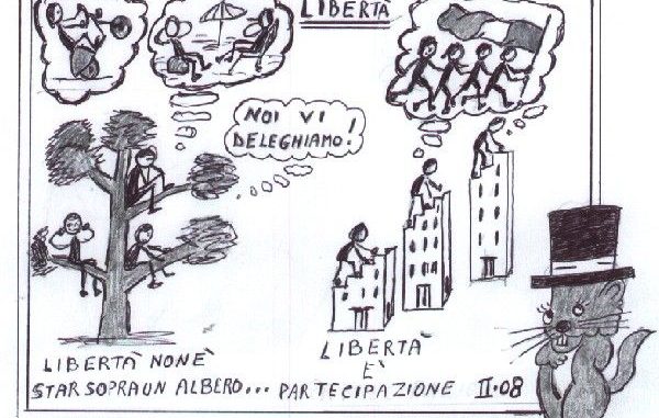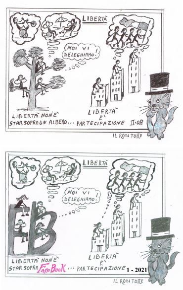 Chiave di volta del conversare, la vignetta, ispirata dal testo, intitolato La libertà, scritto nel ’72 del XX secolo e cantato da Giorgio Gaber, tra i più autentici e schietti canta– autori italiani, dalla limpida e cristallina vena poetica del disincanto ch’è amore per la vita. Una nuvoletta-fumetto, quella di Gaber, ben celebre e diffusa, che nel distico recita … La libertà non è star sopra un albero \ … libertà è partecipazione … In vignetta, il secondo elemento del distico diventa … non è star su fake news …