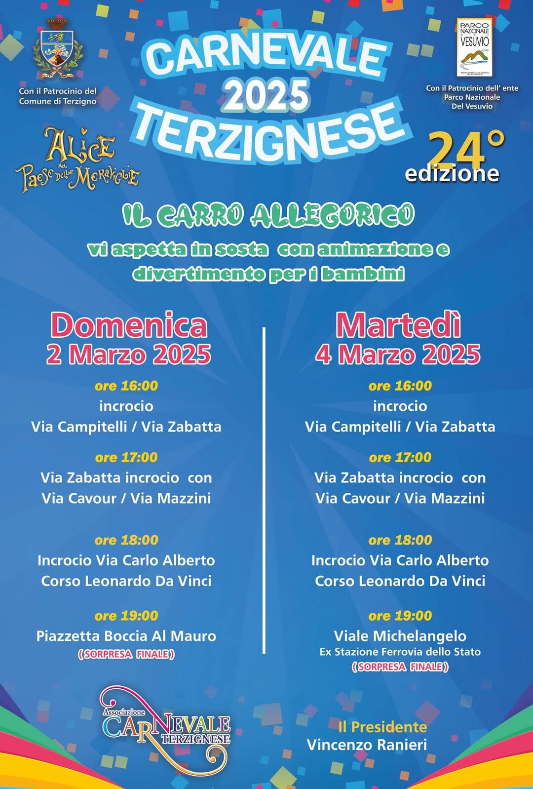 Il Carnevale Terzignese torna nel 2025 con la sua 24ª edizione, promettendo due giornate di festa all’insegna dell’allegria, della musica e dell’intrattenimento per i più piccoli. L’evento, patrocinato dal Comune di Terzigno e dall’Ente Parco Nazionale del Vesuvio, si svolgerà domenica 2 marzo e martedì 4 marzo, coinvolgendo diverse zone della città.