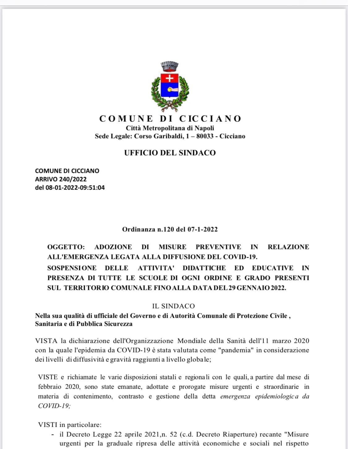 All’ordinanza del Governatore De Luca che ha chiuso fino al 29 gennaio 2022 le scuole primarie e medie di tutta la Regione Campania, a Cicciano il primo cittadino, Giovanni Corrado, ha ulteriormente inasprito la chiusura lasciando a casa tutti gli studenti di ogni ordine e grado sempre fino al 29 gennaio.