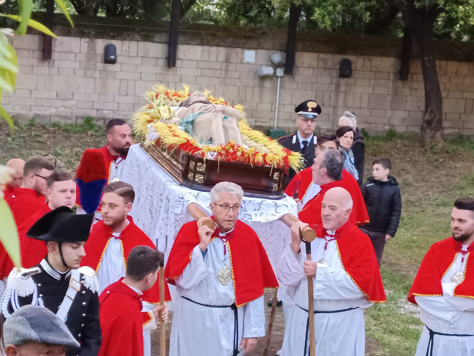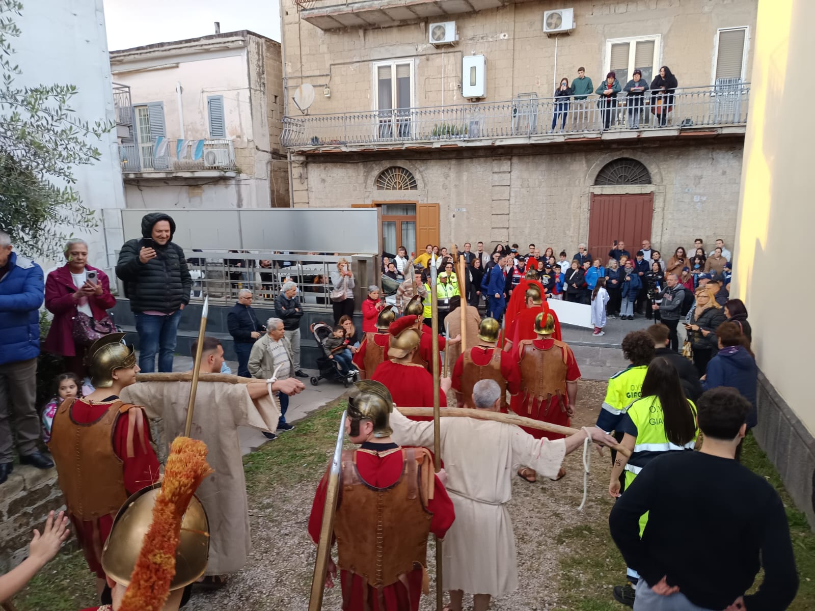 Dalla preghiera nell’orto degli ulivi al confronto con il Sinedrio, dalla flagellazione al caricamento della Croce, la narrazione ha preso corpo con una forza visiva ed emotiva straordinaria. Il corteo ha poi proseguito tra le strade del paese, accompagnato dal silenzio composto dei fedeli. Gesù ha incontrato la Madre, è caduto tre volte, è stato aiutato da Simone di Cirene e asciugato dalla Veronica. Ogni stazione, un frammento di dolore condiviso, di meditazione collettiva.