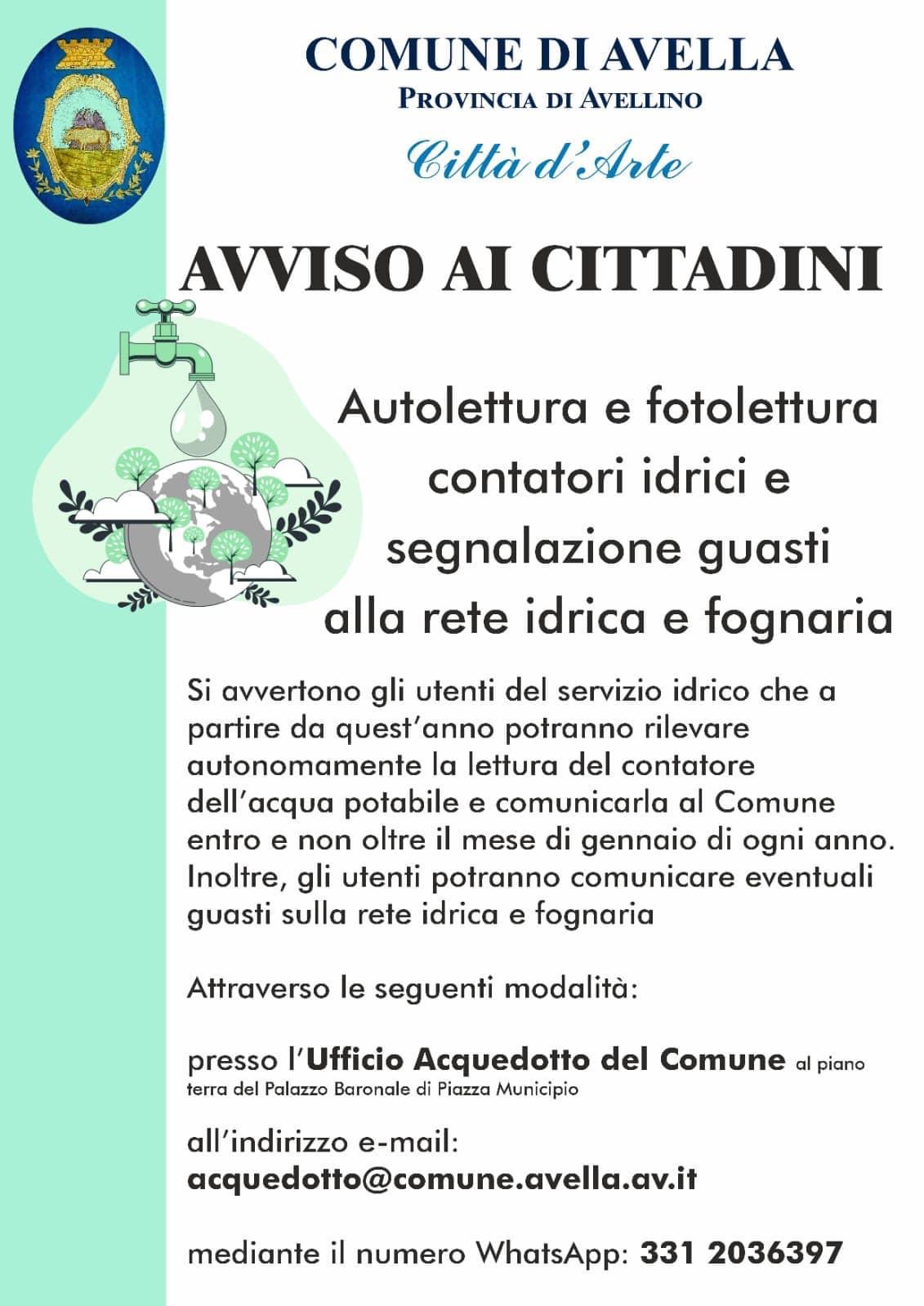 Il Comune di Avella, nell’ottica di migliorare il servizio idrico e di favorire una comunicazione diretta tra cittadini e amministrazione, ha diffuso un avviso rivolto agli utenti del servizio idrico comunale.