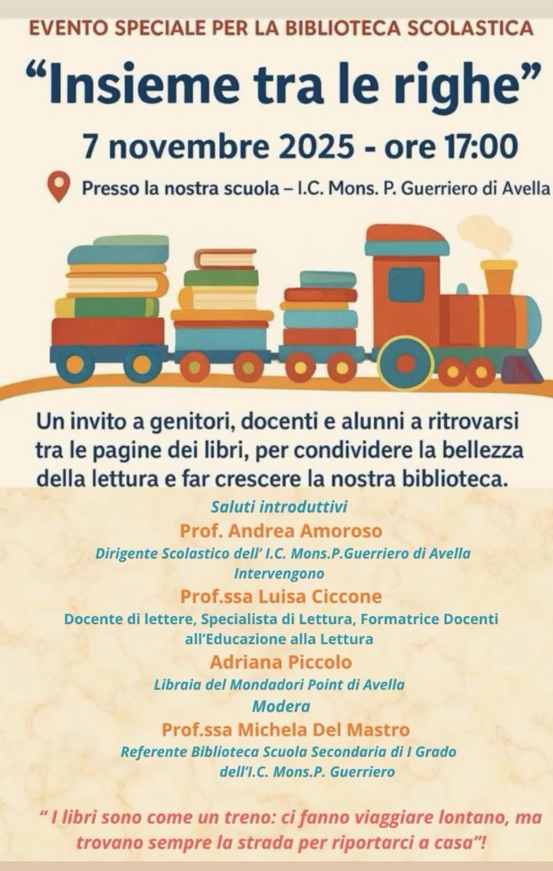AVELLA (AV) – La passione per la lettura torna protagonista all’Istituto Comprensivo Mons. Pasquale Guerriero di Avella, che il prossimo 7 novembre 2025 alle ore 17:00 aprirà le porte della propria scuola per l’evento “Insieme tra le righe”, un appuntamento dedicato a genitori, docenti e alunni per condividere la bellezza dei libri e far crescere la biblioteca scolastica.