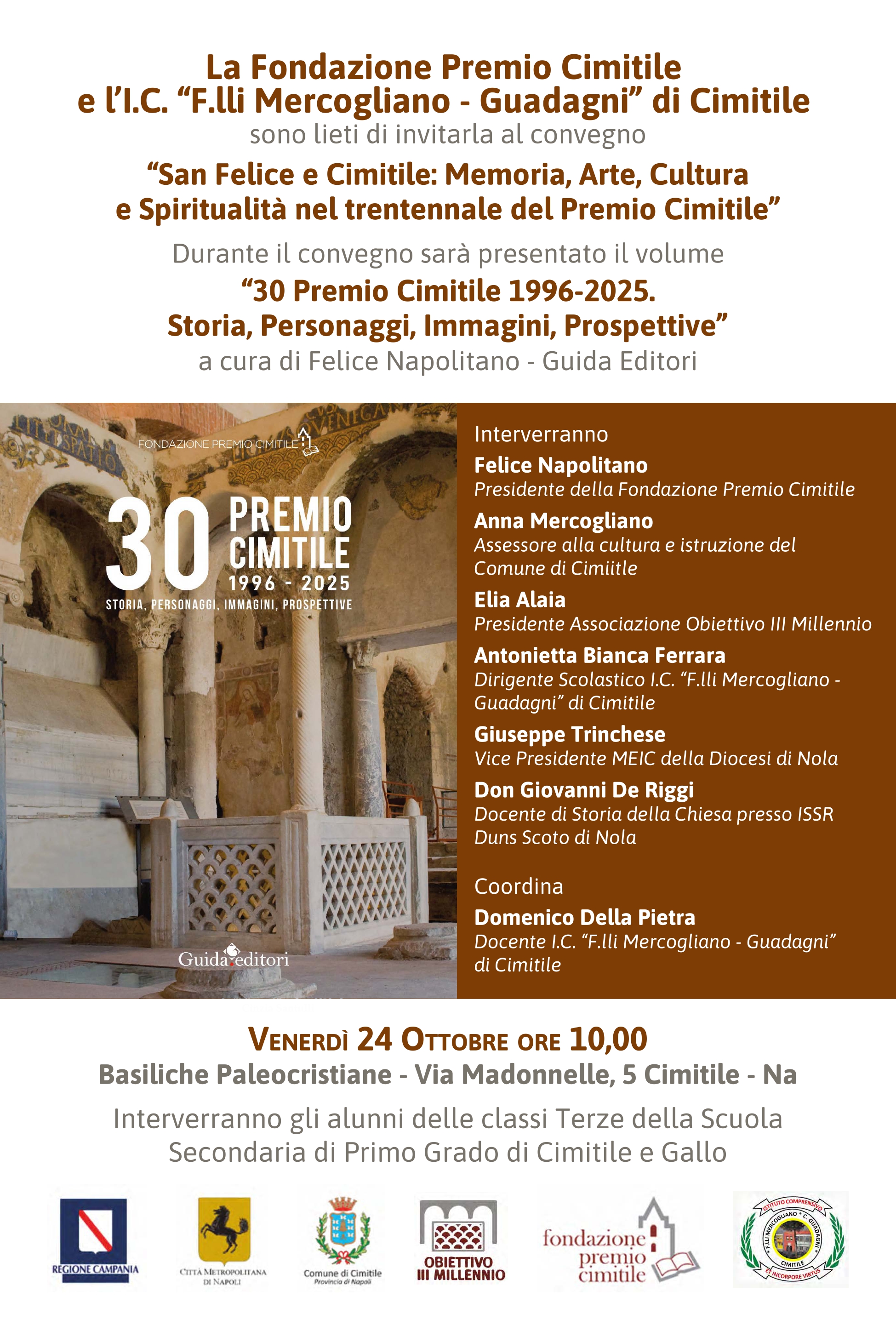 Alla presentazione del volume interverranno: Felice Napolitano, Presidente della Fondazione Premio Cimitile; Anna Mercogliano, Assessore alla Cultura e Istruzione del Comune di Cimitile; Elia Alaia, Presidente dell’Associazione Obiettivo III Millennio; Antonietta Bianca Ferrara, Dirigente Scolastico I. C. “F.lli Mercogliano-Guadagni” di Cimitile; Giuseppe Trinchese, Vice Presidente MEIC della Diocesi di Nola; Don Giovanni De Riggi, Docente di Storia della Chiesa ISSR Duns Scoto di Nola, Parroco di Cimitile. Coordinerà: Domenico Della Pietra, Docente I. C. “F.lli Mercogliano-Guadagni” di Cimitile. Interverranno gli alunni delle classi III della Scuola Secondaria di primo grado di Cimitile e Gallo.