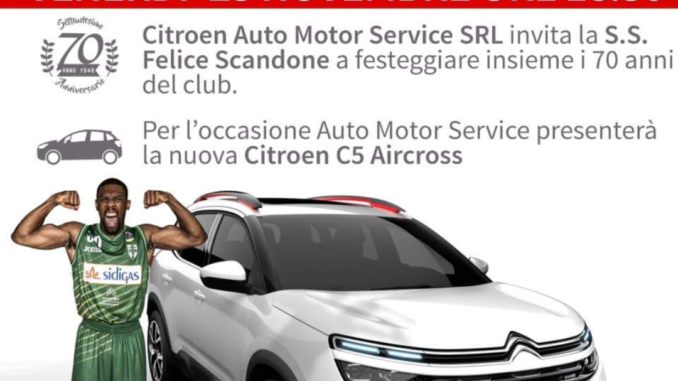 La Società è lieta di comunicare inoltre che venerdì 23 novembre, a partire dalle ore 18.30, Auto Motor Service srl invita la S.S. Felice Scandone a festeggiare insieme i 70 anni di storia del club presso la concessionaria sita ad Avellino in Via Pianodardine. Per l’occasione, Auto Motor Service presenterà la nuova Citroen C5 Aircross.