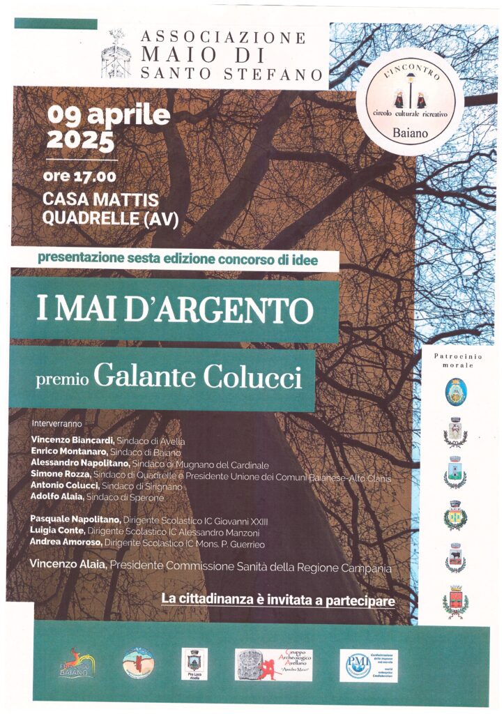 Si terrà il prossimo 9 aprile alle ore 17.00, presso la suggestiva cornice di Casa Mattis a Quadrelle, la presentazione ufficiale della sesta edizione del concorso di idee “Mai d’Argento”, un’iniziativa culturale promossa dall’Associazione Maio di Santo Stefano, con il patrocinio morale di numerosi enti istituzionali del territorio.