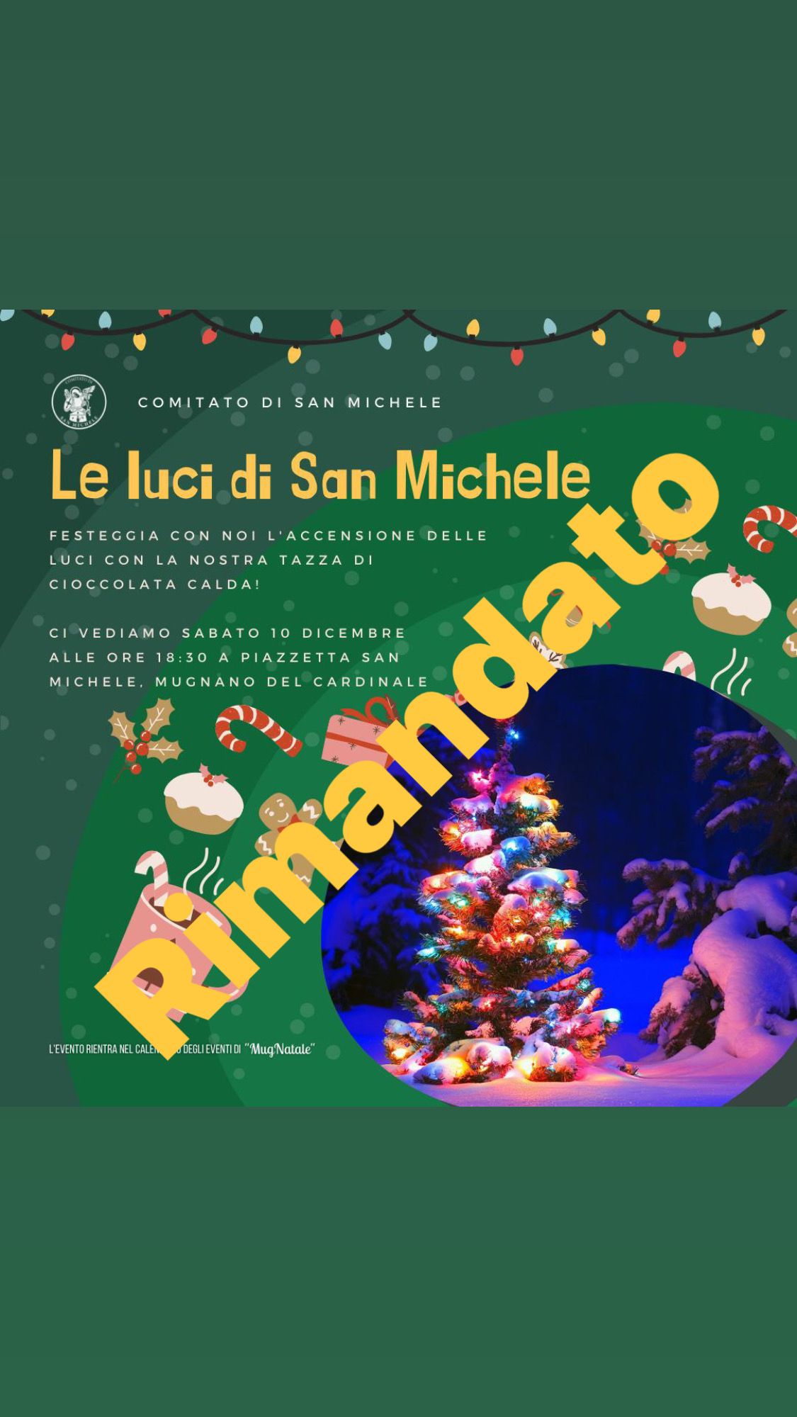 La serata sarà comunque posticipata a domani, domenica 11 dicembre, alle 18:30, sperando di non essere costretti a rimandare nuovamente a causa del cattivo tempo. Il Comitato San Michele si scusa per l’inconveniente e vi aspetta domani sera.