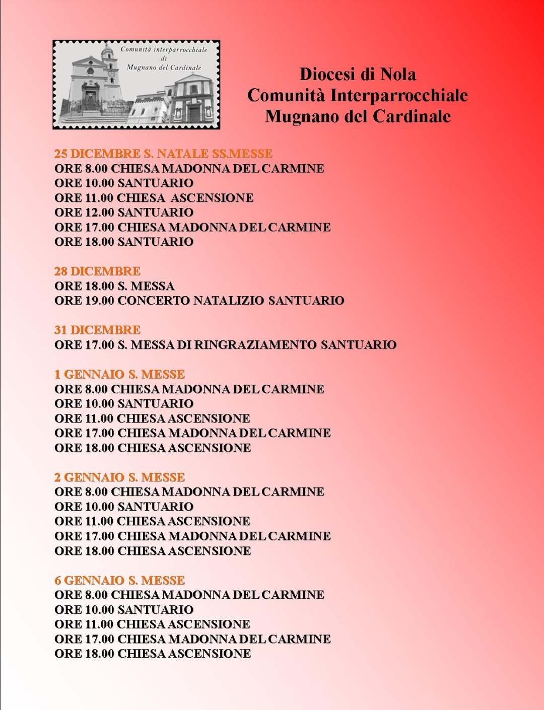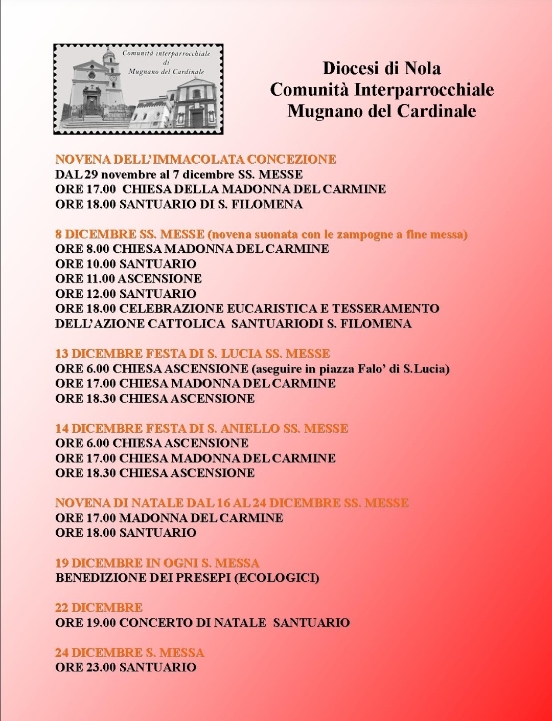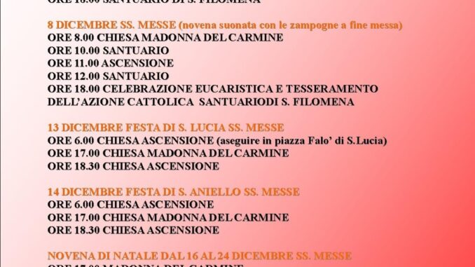 Siamo in pieno Avvento ed è stato reso noto il programma religioso per il periodo natalizio. Il 29 novembre è iniziata la Novena all’Immacolata Concezione con due celebrazioni giornaliere, una alle 17 nella parrocchia del Carmine e San Liberatore e l’altra alle 18 al Santuario di Santa Filomena. L’8 dicembre al termine di ogni Celebrazione Eucaristica ci sarà l’esibizione degli zampognari, durante la celebrazione delle 18, al Santuario, si terrà l’adesione all’azione cattolica. Il 13 dicembre dopo la Santa Messa, delle ore 6 che sarà celebrata nella parrocchia dell’Ascensione, si terrà, come di consueto, il falò in piazza Umberto I in onore dei Santi Lucia ed Aniello. Il 14 dicembre, la prima messa sarà celebrata alle 6 sempre nella parrocchia dell’Ascensione. Dal 16 al 24 dicembre ci sarà la Novena del Natale. Il 19 durante la celebrazione delle 11 saranno benedetti i presepi ecologici. Il 22 dicembre al Santuario, alle ore 19, si terrà il concerto di Natale. Il 24 dicembre alle ore 23, sarà celebrata la Santa Messa della Vigilia. Il 25 dicembre le messe saranno celebrate in tutte le chiese del paese. Il 28 dicembre alle 19 ci sarà, sempre nel Santuario, il concerto di Natale. Il 31 il Te Deum sarà celebrato alle ore 17 nel Santuario. Il 1 e il 6 gennaio 2022 le messe saranno celebrate in tutte le chiese.