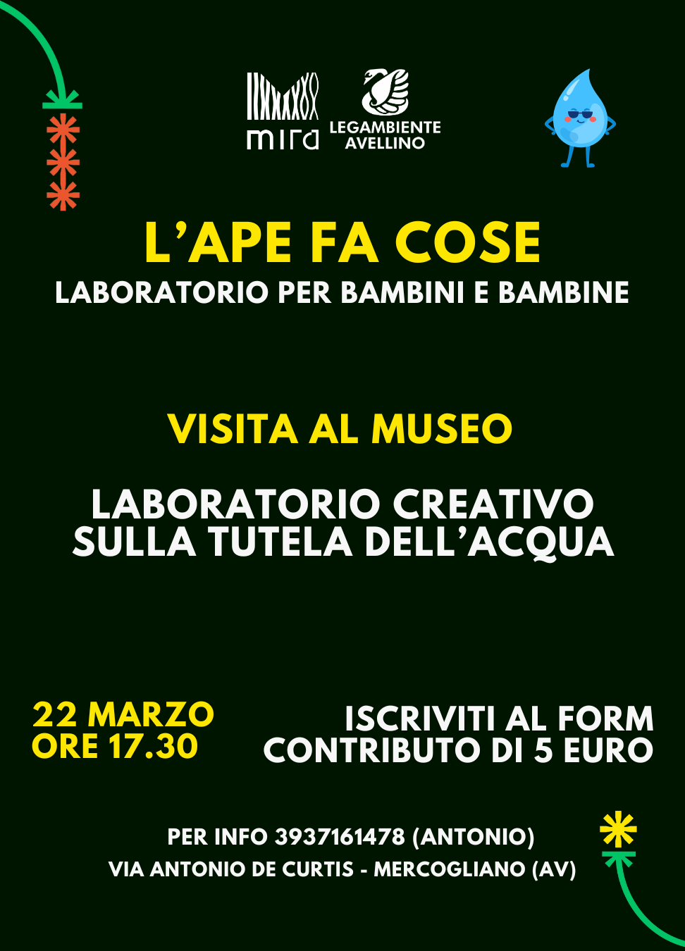 Legambiente Avellino – Alveare invita bambini e bambine a partecipare a un laboratorio creativo dedicato alla tutela della risorsa idrica, che si terrà sabato 22 marzo alle 17.30 presso il Museo M.I.R.A.(Museo Irpino delle Radici Aumentate), situato in via Antonio De Curtis a Mercogliano (AV).