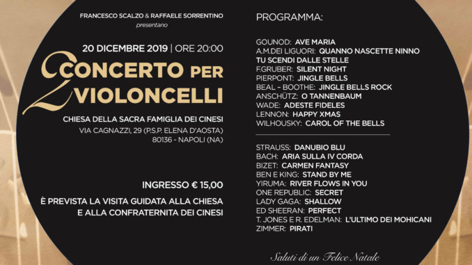 Venerdì sera Carmela Caccioppoli, responsabile della programmazione culturale del Museo delle Arti Sanitarie, condurrà i visitatori nel complesso, situato sulla collina, detta anticamente dei ‘Pirozzoli’, che sovrasta il borgo della Sanità, al quale si accedeva dalla Salita dei cinesi che, ancora nel ‘700, rappresentava l’unica via di passaggio, percorribile a piedi o in portantina, verso l’altura di Capodimonte. L’itinerario proseguirà tra le bellezze della Chiesa, nell’androne affrescato con lo stemma della Congregazione della Sacra Famiglia di Gesù Cristo, realizzato su disegno di Matteo Ripa. Dopo la visita vi sarà un concerto per due violoncelli: Francesco Scalzo e Raffaele Sorrentino eseguiranno brani classici della tradizione natalizia.