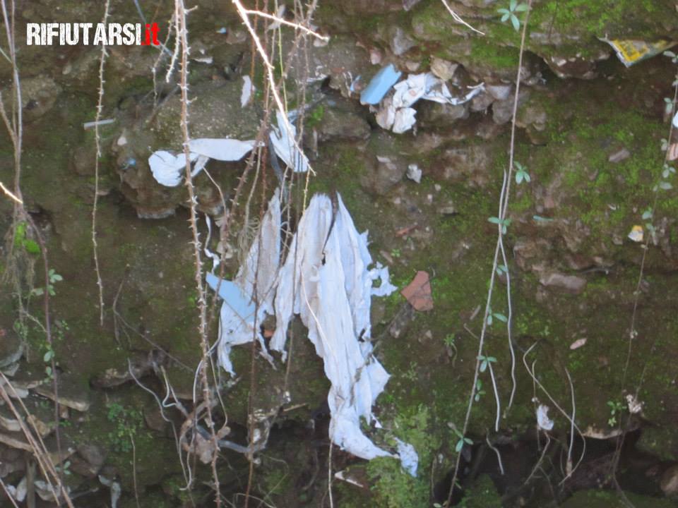 51 sono i siti in Campania individuati dal Ministro delle Politiche Agricole Alimentari e Forestali come campi a rischio per la coltivazione. Il totale della superficie potenzialmente inquinante ricoprirebbe poco più del 2% del territorio della regione. Da parte di associazioni, comitati e singoli cittadini sono stati esposti 1000 e più dubbi sulla validità di tali studi. Il timore è che le analisi siano state fatte troppo frettolosamente per permettere un’accurata catalogazione di tutti i siti a rischio. Nell’elenco potrebbe rientrare, ma non è l’unico esempio, un campo abbandonato ubicato a Casamarciano nei pressi della Strada Nazionale 7bis. Il suolo non è piano e regolare, ma è caratterizzato da un susseguirsi di collinette, probabilmente generate da precedenti sommovimenti del terreno. Sparsi sulla vi si trovano rifiuti come corde e taniche, le buste di plastica sono diventate ormai un tutt’uno col terreno; ma è al centro del campo che ci troviamo di fronte ad una vistosa anomalia: un’enorme voragine dal diametro di circa 2-3 metri e profonda almeno 3. Probabilmente la voragine è nata in seguito ad uno smottamento del terreno dovuto alle recenti piogge. Osservando le pareti e il fondo del cratere è possibile intravedere, incastrati nel terreno, rifiuti speciali come buste di plastica, big bags industriali, numerosi tubi, chili di mattonelle, tonnellate di scarti edili e pneumatici usurati. Com’è possibile vedere dalle foto, la disposizione a strati alternati di terreno e rifiuti indicherebbe che questi sono stati intombati progressivamente.