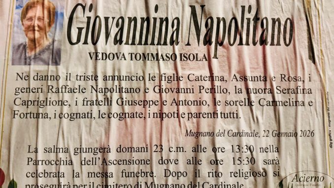 Si è spenta all’età di 84 anni Giovannina Napolitano, vedova di Tommaso Isola. La notizia della sua scomparsa ha suscitato profondo cordoglio nella comunità di Mugnano del Cardinale, dove la donna era conosciuta e stimata.