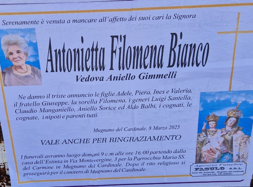 Mugnano del Cardinale – La comunità si stringe nel dolore per la scomparsa della signora Antonietta Filomena Bianco, vedova Aniello Gimmelli, venuta a mancare serenamente all’affetto dei suoi cari.