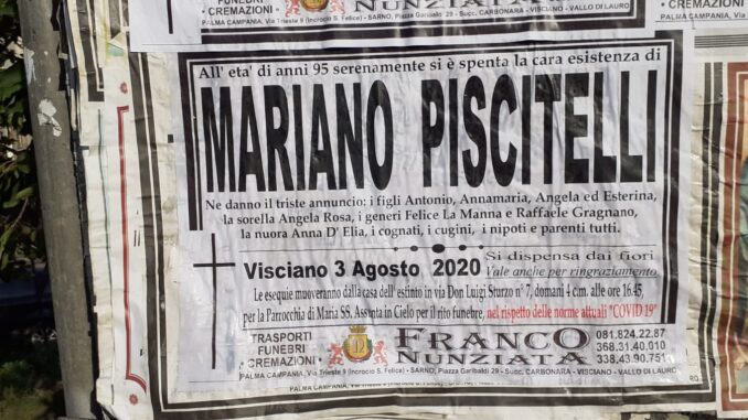 L’associone ATAPC è vicina al socio Pellegrino Foglia per la perdita di NONNO MARIANO. Cordoglio da parte del presidente, soci e direttivo ai familiari e parenti tutti. . Cordoglio unanime dalla redazione tutta.NON E PIU. Visciano, lutto Mariano Piscitelli