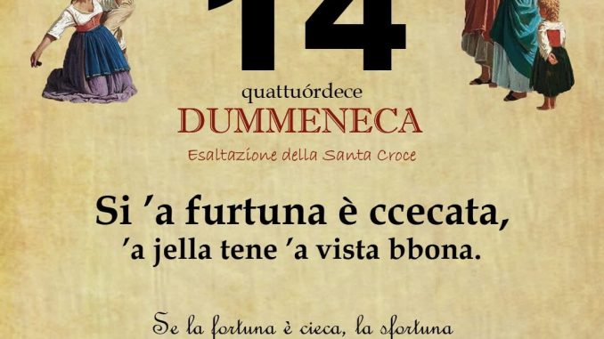 ‘O PRUVERBIO D’ ‘O JUORNO. Domenica 14 settembre 2025 14/09/2025 binews.it EVIDENZA, Il Proverbio del Giorno, Uncategorized 0 di Gianni PolverinoSi ’a furtuna è ccecata, ’a jella tene ’a vista bbona. Se la fortuna è cieca, la sfortuna ci vede benissimo.