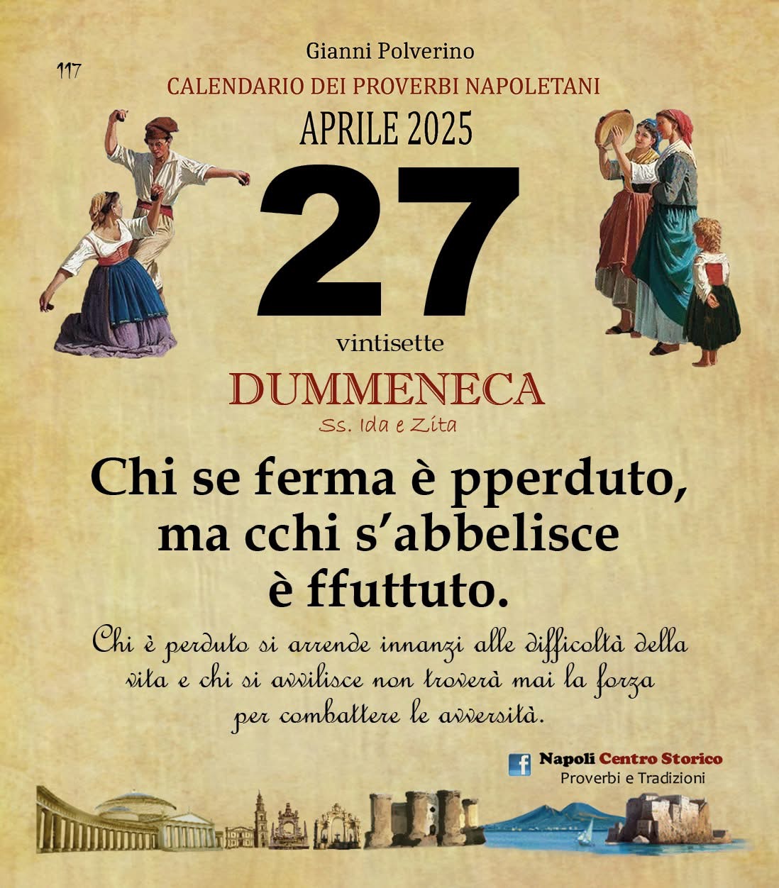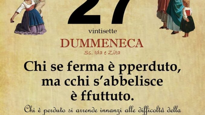 ‘O PRUVERBIO D’ ‘O JUORNO. Domenica 27 aprile 2025 27/04/2025 binews.it EVIDENZA, Il Proverbio del Giorno, Uncategorized 0 di Gianni Polverino Chi se ferma è pperduto, ma cchi s’abbelisce è ffuttuto. Chi è perduto si arrende innanzi alle difficoltà della vita e chi si avvilisce non troverà mai la forza per combattere le avversità.
