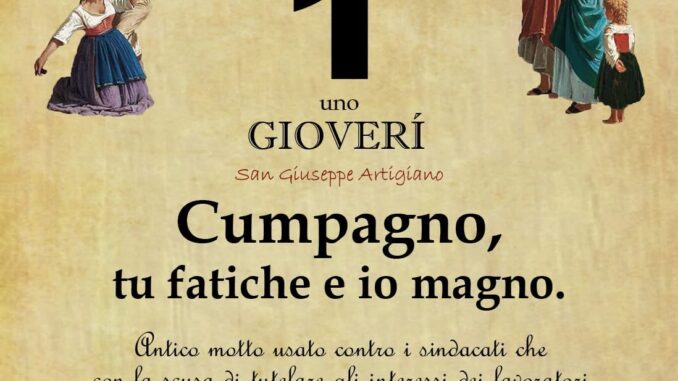 ‘O PRUVERBIO D’ ‘O JUORNO. Giovedì 1 maggio 2025 01/05/2025 binews.it EVIDENZA, Il Proverbio del Giorno, Uncategorized 0 di Gianni Polverino Cumpagno, tu fatiche e io magno. Antico motto usato contro i sindacati che con la scusa di tutelare gli interessi dei lavoratori accontentavano i capitalisti.