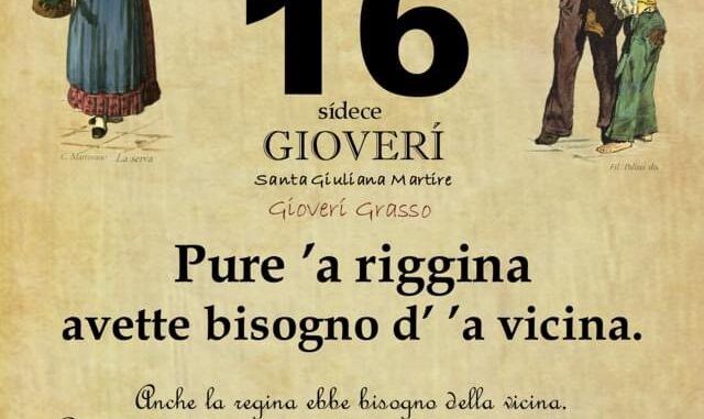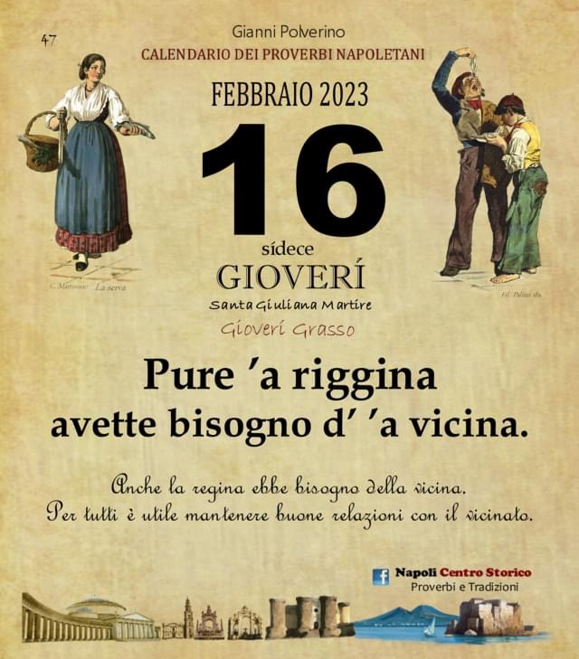 ‘O PRUVERBIO D’ ‘O JUORNO. Giovedì 16 febbraio 2023 16/02/2023 binews.it ATTUALITA', EVIDENZA, Il Proverbio del Giorno, Uncategorized 0 di Gianni Polverino Pure ’a riggina avette bisogno d’ ’a vicina. Anche la regina ebbe bisogno della vicina. Per tutti è utile mantenere buone relazioni con il vicinato.
