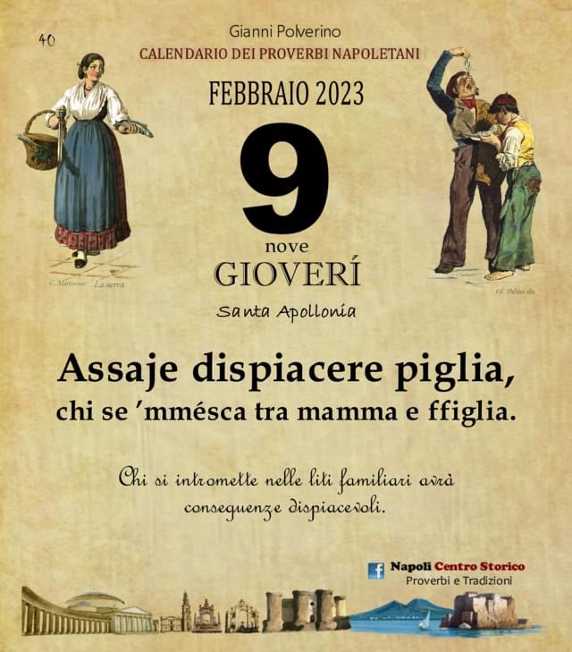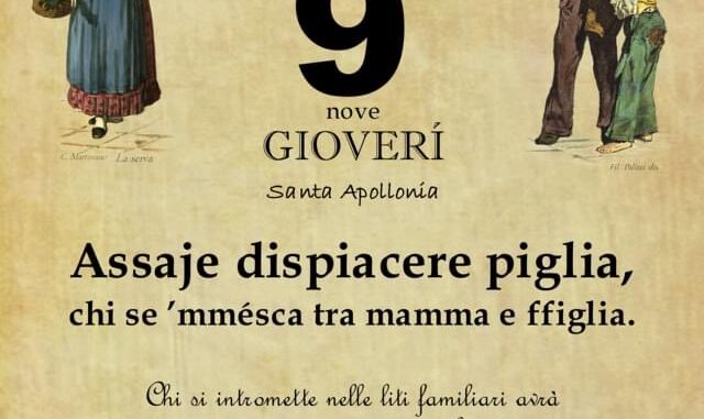 ‘O PRUVERBIO D’ ‘O JUORNO. Giovedì 9 febbraio 2023 09/02/2023 binews.it ATTUALITA', EVIDENZA, Il Proverbio del Giorno, Uncategorized 0 di Gianni Polverino Assaje dispiacere piglia, chi se ’mmésca tra mamma e ffiglia. Chi si intromette nelle liti familiari avrà conseguenze dispiacevoli.
