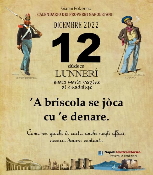 ‘O PRUVERBIO D’ ‘O JUORNO. Lunedì 12 dicembre 2022 12/12/2022 binews.it ATTUALITA', EVIDENZA, Il Proverbio del Giorno, Uncategorized 0 di Gianni Polverino’A briscola se jòca cu ’e denare. Come nei giochi di carte, anche negli affari, occorre denaro contante.