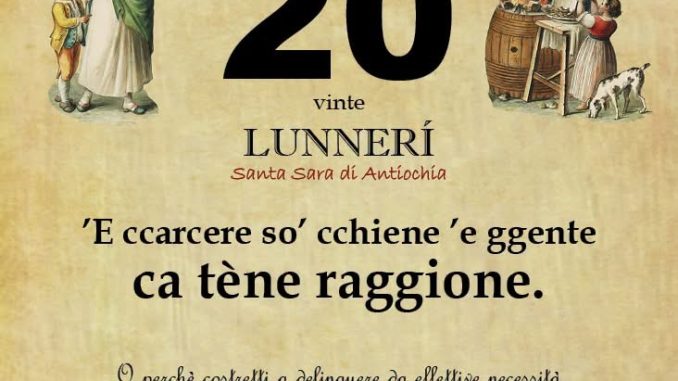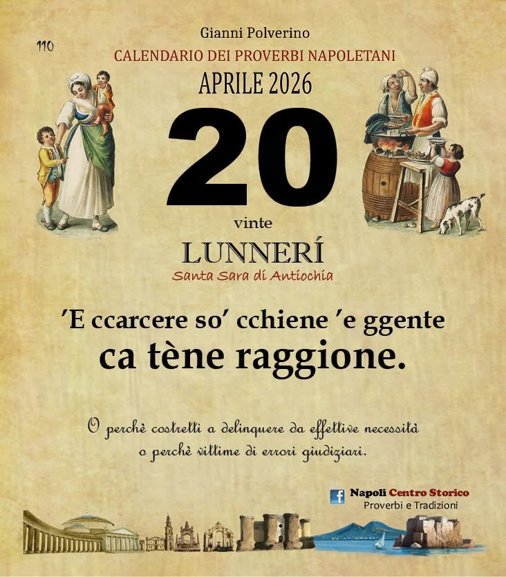 ‘O PRUVERBIO D’ ‘O JUORNO. Lunedì 20 aprile 2026 20/04/2026 binews.it EVIDENZA, Il Proverbio del Giorno, Uncategorized 0 di Gianni Polverino ’E ccarcere so’ cchiene ’e ggente ca tène raggione. O perchè costretti a delinquere da effettive necessità o perchè vittime di errori giudiziari.