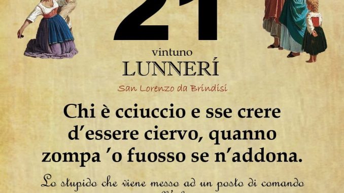 ‘O PRUVERBIO D’ ‘O JUORNO. Lunedì 21 luglio 2025 21/07/2025 binews.it EVIDENZA, Il Proverbio del Giorno, Uncategorized 0 di Gianni Polverino Chi è cciuccio e sse crere d’essere ciervo, quanno zompa ’o fuosso se n’addona. Lo stupido che viene messo ad un posto di comando pur non essendone all’altezza prima o poi si accorgerà della sua incapacità.
