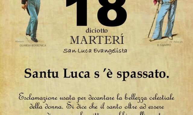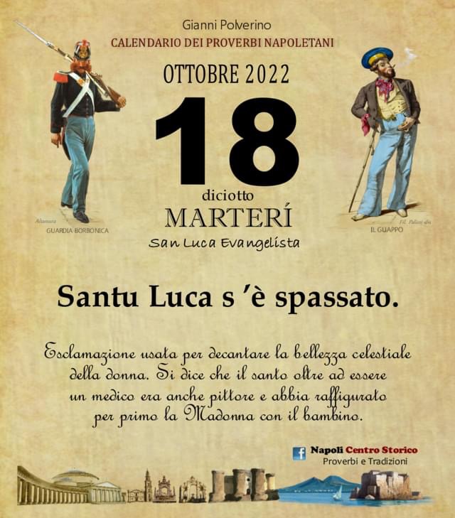 ‘O PRUVERBIO D’ ‘O JUORNO. Martedì 18 ottobre 2022 18/10/2022 binews.it EVIDENZA, Il Proverbio del Giorno, Uncategorized 0 di Gianni PolverinoSantu Luca s ’è spassato. Esclamazione usata per decantare la bellezza celestiale della donna. Si dice che il santo oltre ad essere un medico era anche pittore e abbia raffigurato per primo la Madonna con il bambino.