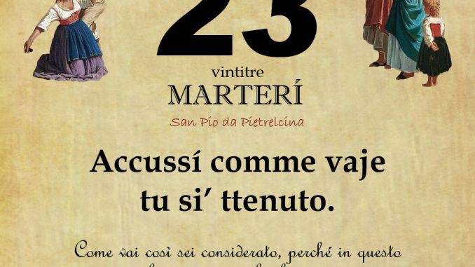 ‘O PRUVERBIO D’ ‘O JUORNO. Martedì 23 settembre 2025 23/09/2025 binews.it EVIDENZA, Il Proverbio del Giorno, Uncategorized 0 di Gianni PolverinoAccussí comme vaje tu si’ ttenuto.Come vai così sei considerato, perché in questo triste secolo si onorano gli abiti e non si dice più da dove vieni, ma come tu vai..