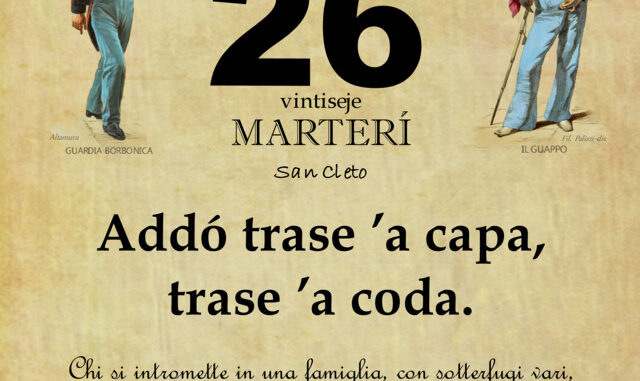 ‘O PRUVERBIO D’ ‘O JUORNO. Martedì 26 aprile 2022 26/04/2022 binews.it EVIDENZA, Il Proverbio del Giorno, Uncategorized 0 di Gianni PolverinoAddó trase ’a capa, trase ’a coda.Chi si intromette in una famiglia, con sotterfugi vari, facendo danni e cattiverie.