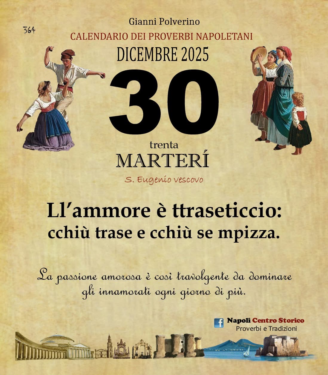 ‘O PRUVERBIO D’ ‘O JUORNO. Martedì 30 dicembre 2025 30/12/2025 binews.it EVIDENZA, Il Proverbio del Giorno, Uncategorized 0 di Gianni PolverinoLl’ammore è traseticcio: cchiù trase e cchiù se mpizza. La passione amorosa è così travolgente da dominare gli innamorati ogni giorno di più.
