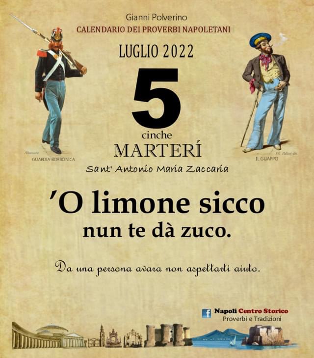 ‘O PRUVERBIO D’ ‘O JUORNO. Martedì 5 luglio 2032 05/07/2022 binews.it ATTUALITA', EVIDENZA, Il Proverbio del Giorno, Uncategorized 0 di Gianni Polverino ’O limone sicco nun te dà zuco. Da una persona avara non aspettarti aiuto.