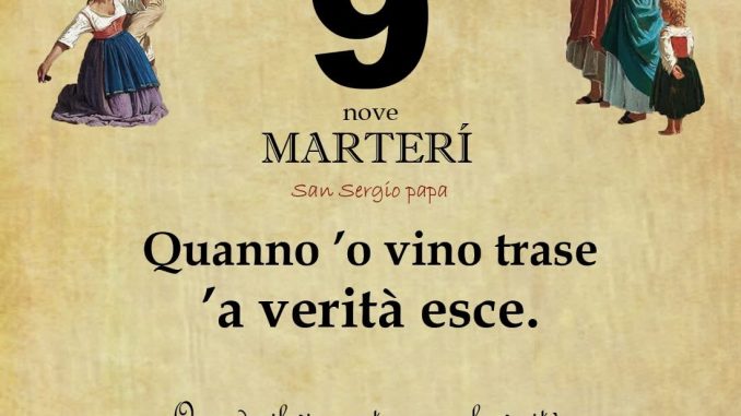 ‘O PRUVERBIO D’ ‘O JUORNO. Martedì 9 settembre 2025 09/09/2025 binews.it EVIDENZA, Il Proverbio del Giorno, Uncategorized 0 di Gianni PolverinoQuanno ’o vino trase ’a verità esce. Quando il vino entra, esce la verità.