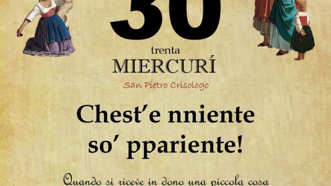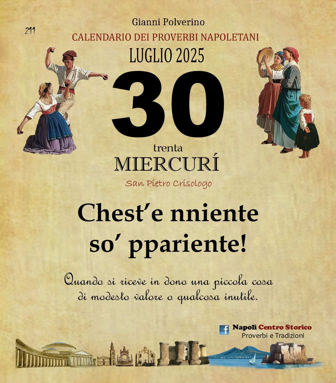 ‘O PRUVERBIO D’ ‘O JUORNO. Mercoledì 30 luglio 2025 30/07/2025 binews.it EVIDENZA, Il Proverbio del Giorno, Uncategorized 0 di Gianni PolverinoChest’e nniente so’ ppariente! Quando si riceve in dono una piccola cosa di modesto valore o qualcosa inutile.