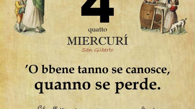 ‘O PRUVERBIO D’ ‘O JUORNO. Mercoledì 4 febbraio 2026 04/02/2026 binews.it EVIDENZA, Il Proverbio del Giorno, Uncategorized 0 di Gianni Polverino’O bbene tanno se canosce quanno se perde. Gli affetti più cari si apprezzano soltanto quando vengono a mancarci.