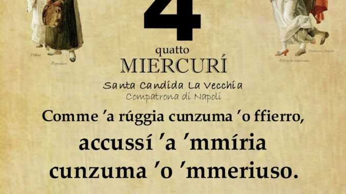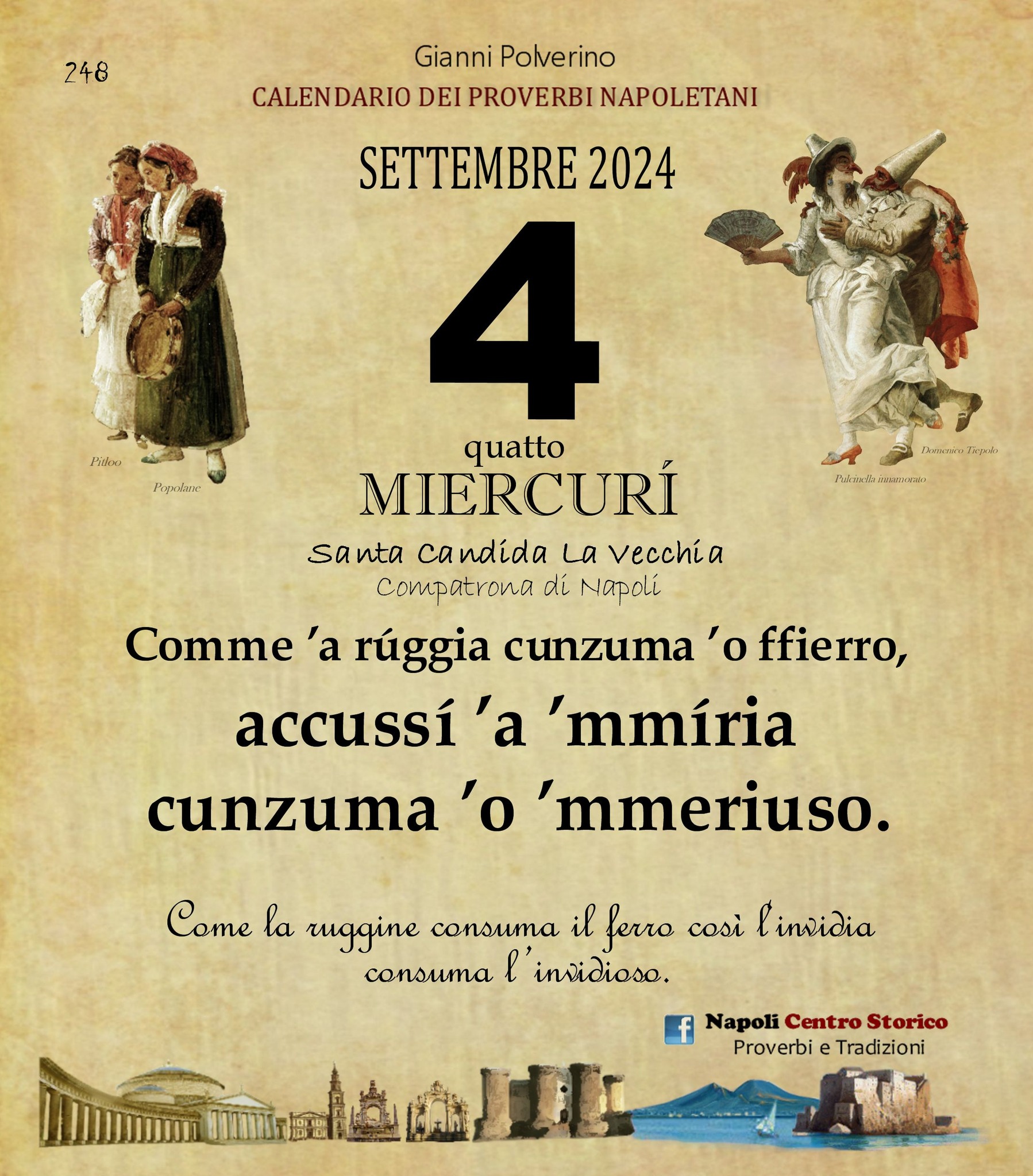 ‘O PRUVERBIO D’ ‘O JUORNO. Mercoledì 4 settembre 2024 04/09/2024 binews.it EVIDENZA, Il Proverbio del Giorno, Uncategorized 0 di Gianni PolverinoComme ’a rúggia cunzuma ’o ffierro, accussí ’a ’mmíria cunzuma ’o ’mmeriuso.Come la ruggine consuma il ferro così l‘invidia consuma l’invidioso