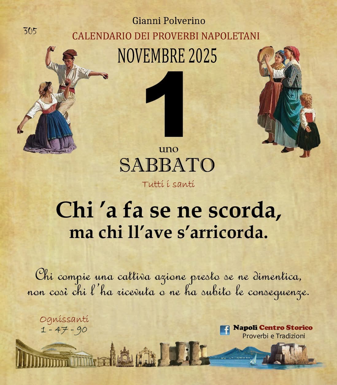 ‘O PRUVERBIO D’ ‘O JUORNO. Sabato 1 novembre 2025 01/11/2025 binews.it EVIDENZA, Il Proverbio del Giorno, Uncategorized 0 di Gianni PolverinoChi ’a fa se ne scorda, ma chi ll’ave s’arricorda. Chi compie una cattiva azione presto se ne dimentica, non così chi l’ha ricevuta o ne ha subito le conseguenze.