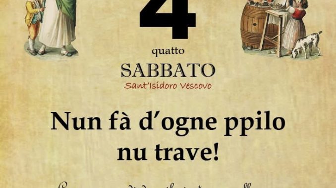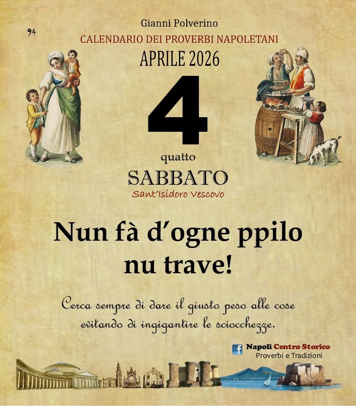‘O PRUVERBIO D’ ‘O JUORNO. Sabato 4 aprile 2026 04/04/2026 binews.it EVIDENZA, Il Proverbio del Giorno, Uncategorized 0 di Gianni Polverino Chi cagna paese cagna furtuna. Chi cambia paese cambia fortuna.