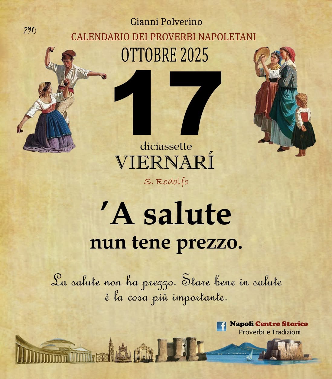 ‘O PRUVERBIO D’ ‘O JUORNO. Venerdì 17 ottobre 2025 17/10/2025 binews.it EVIDENZA, Il Proverbio del Giorno, Uncategorized 0 di Gianni Polverino’A salute nun tene prezzo. La salute non ha prezzo. Stare bene in salute è la cosa più importante.