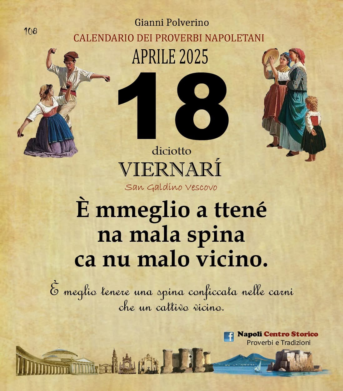 ‘O PRUVERBIO D’ ‘O JUORNO. Venerdì 18 aprile 2025 18/04/2025 binews.it EVIDENZA, Il Proverbio del Giorno, Uncategorized 0 di Gianni Polverino È mmeglio a ttené na mala spina ca nu malo vicino. È meglio tenere una spina conficcata nelle carni che un cattivo vicino.