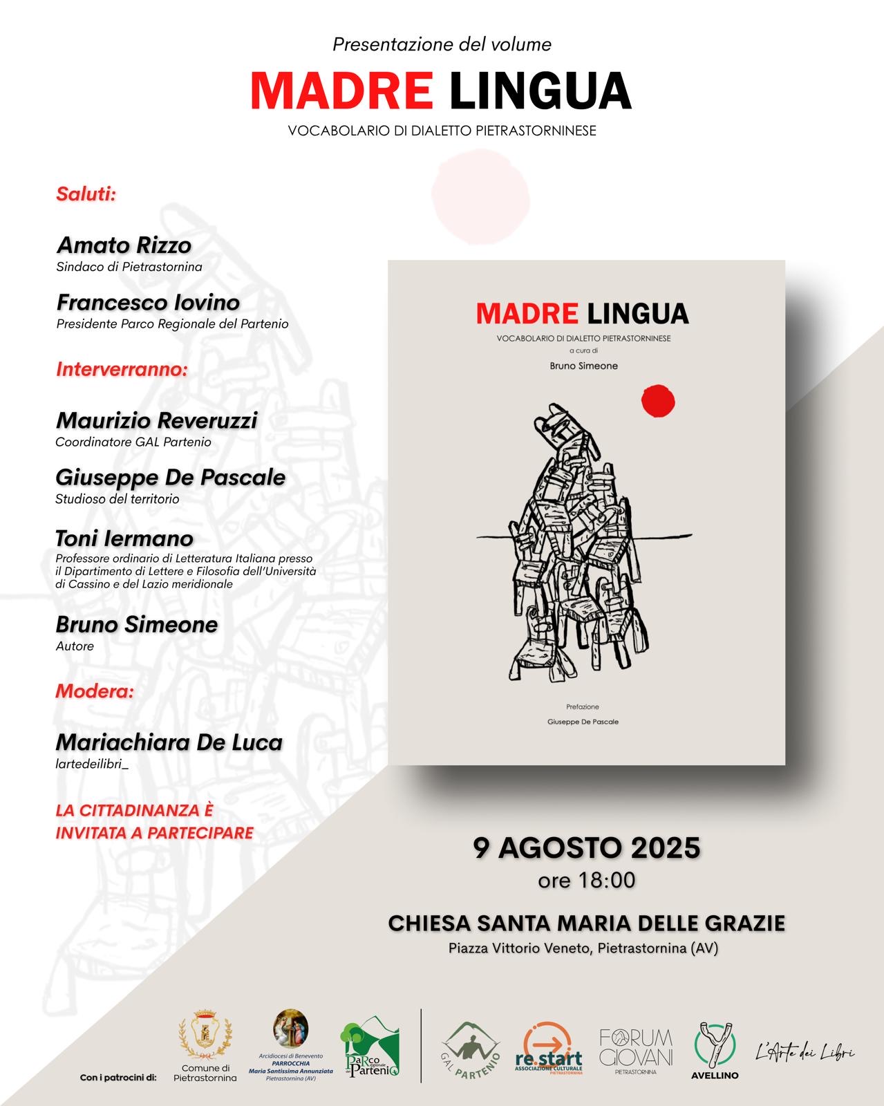 Un viaggio nella memoria, nelle radici e nella voce collettiva di una comunità. È quanto propone “Madre Lingua. Vocabolario di dialetto pietrastorninese”, volume curato da Bruno Simeone, che sarà presentato il 9 agosto, alle ore 18:00, presso la Chiesa di Santa Maria delle Grazie a Pietrastornina. L’opera rappresenta il secondo atto di un percorso culturale dedicato alla valorizzazione del dialetto locale, promosso dal G.A.L. Partenio e patrocinato dall’associazione culturale Restart. Un’iniziativa che intende raccogliere e restituire suoni, parole e significati altrimenti destinati all’oblio, costruendo una sorta di archivio affettivo e linguistico per chi è lontano, nel tempo o nello spazio.