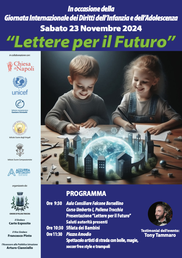 Una giornata dedicata ai bambini, ai loro diritti, ai loro sogni e alle loro lettere per il futuro. L’Amministrazione Comunale di Pollena Trocchia ha organizzato, in occasione della Giornata Internazionale per i diritti dell’Infanzia e dell’Adolescenza, un’intera mattinata che vedrà come protagonisti i giovani studenti delle scuole del territorio. L’iniziativa, in programma sabato 23 novembre, sarà realizzata in collaborazione con l’istituto comprensivo Gaetano Donizetti, l’Istituto Suore degli Angeli, l’istituto Sacro Cuore delle Suore Compassioniste, Unicef, Chiesa Metropolitana di Napoli e Azzurra Spettacoli: una sinergia tra istituzioni locali, scuola, chiesa e associazioni che mette al centro i più piccoli, giovani cittadini oggi, protagonisti del futuro domani. Si parte alle 9.30 nell’aula consiliare “Falcone-Borsellino”, dove dopo una breve introduzione gli alunni delle classi quinte esporranno le loro “lettere per il futuro” a cui seguiranno le riflessioni delle autorità presenti. A seguire, la sfilata dei bambini per arrivare in Piazza Amodio, dove, a partire dalle ore 11.30, si terrà lo spettacolo degli artisti di strada con bolle, magie, trampoli ed esibizioni di soccer free style. Testimonial dell’iniziativa, il noto artista Tony Tammaro, cantautore specializzato ed apprezzato per i suoi brani parodistici. «Non si può amministrare oggi senza pensare al domani. Per questo la nostra Amministrazione comunale mette sempre al centro del proprio agire le generazioni più giovani, a maggior ragione in occasione di ricorrenze come la Giornata Internazionale dei diritti dell’Infanzia e dell’Adolescenza. Abbiamo immaginato un’occasione di divertimento per i più piccoli, all’insegna della condivisione e dello stare insieme, ma che possa anche servire a noi istituzioni per avere maggiore consapevolezza di quello che desiderano per domani i bambini di oggi: è nostro dovere creare le condizioni per provare a realizzarlo» hanno commentato a una voce il sindaco di Pollena Trocchia Carlo Esposito, il vicesindaco Francesco Pinto e l’assessore alla Pubblica Istruzione Arturo Cianniello.