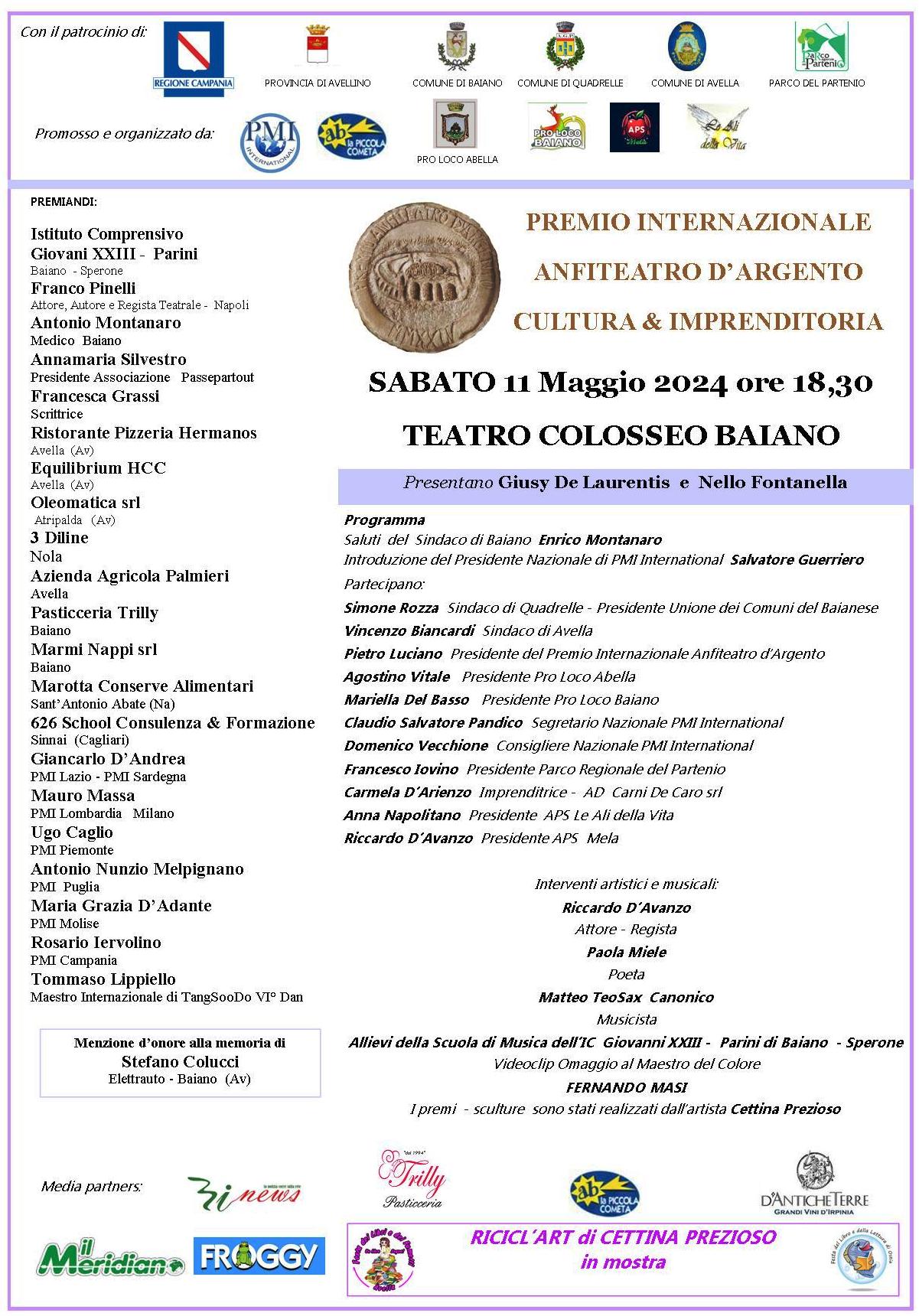 Il Premio Internazionale Anfiteatro d’Argento Cultura e Imprenditoria che consegnerà ufficialmente i 22 riconoscimenti per la cultura, l’imprenditoria, la storia ai premiandi , evento che sarà guidato, come sempre, dal giornalista Nello Fontanella, che pur essendo impegnato a Napoli per l’arrivo della 9° tappa del giro d’Italia (Avezzano – Napoli) ha garantito la sua presenza alla kermesse di sabato 11 maggio al teatro Colosseo di Baiano, affiancato da Giusy De Laurentis, dirigente dell’ Istituto nazionale di documentazione, innovazione e ricerca educativa e impegnata animatrice culturale baianese. Un ricco programma artistico animerà la serata: nella hall del teatro, gli ospiti potranno ammirare la mostra il “Ricicl’art” di Cettina Prezioso, artista della cartapesta; e quella permanente di fotografia di Joseph Noviello dedicata alla Festa del Maio di Baiano.
