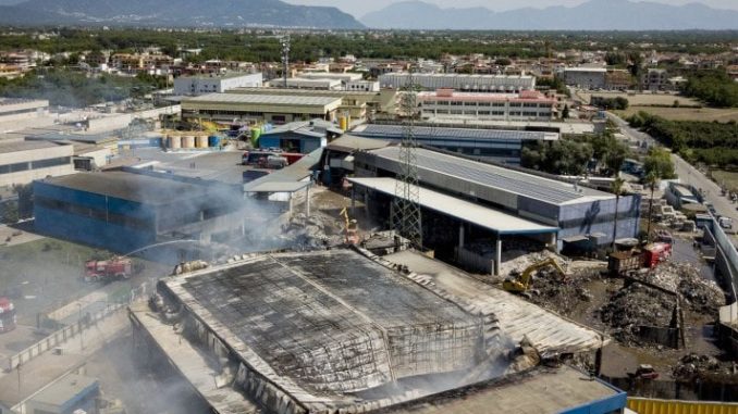Si traccia un primo bilancio di profilo sociale sul mega-incendio che ha investito uno dei capannoni di Ambiente Spa -con filiera d’azienda operante in via Ponte delle Tavole-  specializzata nello stoccaggio e nel trattamento per il riciclo dei rifiuti differenziati, tra cui i materiali di plastica, “ospitando” la piattaforma del Conai, il Consorzio nazionale per il recupero e il riciclo degli imballaggi. Il primo elemento che risalta è costituito dalla mobilitazione scattata nell’ambito dei vari livelli delle competenze delle Istituzioni territoriali, dalla Regione-Campania alla Città metropolitana di Napoli e ai Comuni dell’area nolana. Una risposta di normalità, innescata dal tempestivo intervento delle squadre dei Vigili del Fuoco, per attivare al meglio dell’efficienza e dell’efficacia il piano strategico di spegnimento del rogo ch’è venuto crescendo in rapida intensità e estensione. Un piano anti-emergenza che ha funzionato in pieno nella giornata di domenica e fino alle ore serali, domando il vasto fronte delle fiamme da cui si sono levate  colonne di fumo grigio-nerastro alte fino a 30 metri, colonne dense e cariche di veleni, ma soprattutto di diossina, in grado di stabilizzarsi e fissarsi con micidiali particelle nell’atmosfera, con ricadute ed effetti ad alto tasso di nocività per l’ecosistema e per tutte le specie viventi, facendo degradare ulteriormente la qualità dell’aria, già condizionata dalla permanente diffusione delle polveri sottili di varia provenienza.