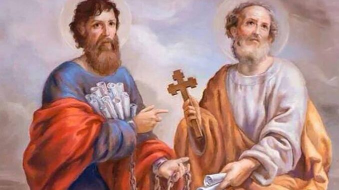 Oggi 29 giugno la chiesa festeggiai santi Pietro e Paolo, la solennità odierna è antichissima: è stata inserita nel Santorale romano molto prima di quella di Natale. Nei secolo IV si celebravano già tre messe: una in san Pietro in Vaticano, l’altra in san Paolo fuori le mura, la terza alle catacombe di san Sebastiano dove furono probabilmente nascosti per un certo tempo, all’epoca delle invasioni, i corpi dei due apostoli; Simone era un pescatore di Betsaida che si era più tardi stabilito a Cafarnao, il fratello Andrea lo introduce al seguito di Gesù, il Cristo gli cambia nome e lo chiama «Pietra», per realizzare nella sua persona il tema della pietra fondamentale. Simon Pietro è uno dei primi testimoni che vede la tomba vuota e dopo l’ascensione egli prende la direzione della comunità cristiana, a Roma, Pietro diviene l’apostolo di tutti, qui egli compie pienamente la sua missione di «pietra angolare», riunendo in un solo «edificio» i Giudei ed i pagani e suggella questa missione con il suo sangue e sotto Nerone dà la sua vita per l’amato Maestro. La tradizione dice che san Pietro ricordandosi anche in quell’estremo momento del suo peccato, e ritenendosi indegno di morire come Gesù, pregasse i carnefici ed ottenesse di essere crocifisso con il capo all’ingiù, probabilmente intorno al 67 d.C.; Saulo, in seguito Paolo, nacque a Tarso, capitale della Cilicia, la sua educazione fu austera quale si conveniva ad un figlio di farisei zelanti della legge, ben presto gli misero in mano la Sacra Bibbia che egli approfondì talmente che, convertito, trasfonderà abbondantemente nei suoi scritti. Frequentò a Gerusalemme la scuola ebraica ed ebbe a precettore il celebre Gamaliele, l’uomo più saggio di Gerusalemme. Da lui si rafforzò nell’amore alle tradizioni ebraiche ed imparò una scrupolosa osservanza delle prescrizioni della legge, a sconvolgere tutta questa educazione, sorse la dottrina del Nazareno che riempiva già Gerusalemme di seguaci e dilagava anche nelle vicine province, Saulo, intransigente fariseo e strenuo difensore della tradizione, li odiò subito a morte, dopo aver assistito alla lapidazione di santo Stefano, intraprese la lotta contro di essi, battaglia che doveva portarlo a quel Gesù che egli inconsciamente perseguitava, appunto mentre cavalcava alla volta di Damasco per perseguitare anche lì i cristiani una luce lo abbaglia e lo fa cade reda cavallo, mentre una voce misteriosa lo rimprovera: «Saulo, Saulo, perché mi perseguiti?»; da quel momento da persecutore diventa perseguitato e la sua parola risuonerà ovunque apportatrice di pace, di luce e di salvezza, dove non può arrivare con la persona, arriva con le sue lettere e con lo zelo dei suoi seguaci, intraprende vari viaggi missionari, l’ultimo, il quarto lo porta a Roma dove viene arrestato e si incontra con Pietro con il quale doveva rendere testimonianza alla verità subendo il martirio. Paolo portato davanti a Nerone viene condannato alla decapitazione, un colpo di spada lo getta tra le braccia del suo amato Signore, probabilmente intorno al 67 d.C.