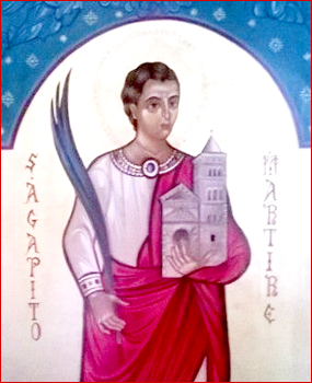 Oggi 18 agosto: sant’Agapito di Praeneste, nacque a Praeneste (Palestrina) intorno alla seconda metà del III secolo d.C. da una famiglia di SANT’Oggi. Lunedì 18 agosto la chiesa celebra sant’Elena e sant’Agapitoalto rango. In giovane età venne avviato agli studi di diritto romano, per questo dovette trasferirsi a Roma. Qui, insieme alle leggi, apprese anche i primi fondamenti della vita di Cristo, attraverso gli insegnamenti del suo maestro Porfirio. Agapito si convertì subito alla religione cristiana, da seguace cadde vittima delle persecuzioni. Arrestato, fu condotto davanti all’imperatore Aureliano che lo esortò a rinunciare alla fede, chiedendogli di sacrificare agli dei, come prova del suo rinnegamento. Agapito, però, oppose il suo fermo rifiuto alla richiesta fattagli da Aureliano e allora quest’ultimo ordinò di punirlo. Il Prefetto di Roma, Flavio Antioco, venne incaricato di seguire direttamente i supplizi e di eseguire la sentenza di morte nel caso in cui il giovane non avesse ritrattato. Le pene inflitte ad Agapito si fecero sempre più crudeli. Venne lasciato senza cibo e acqua per giorni interi. Risultate vane queste ultime, si decise di rovesciargli addosso un vaso pieno di braci ardenti. L’azione, però, non diede l’effetto desiderato: Agapito, invece di urlare per il dolore, alzò con limpida voce un ringraziamento a Dio. Irritato il Prefetto ordinò di legarlo ad un albero a testa in giù e di esporlo alle fiamme di un focolare. Anche questo supplizio non sortì gli effetti desiderati. Passati cinque giorni, si credeva che oramai il giovane fosse morto per i patimenti subiti, il Prefetto si trovò davanti uno spettacolo che andava oltre ogni sua previsione: il giovane era slegato ed in buona salute, le ferite del corpo sanate, il corpo coperto da una candida veste. A quanto pare il suo Dio non l’aveva abbandonato ed aveva inviato a lui un angelo affinché lo sciogliesse dai suoi affanni. Le condanne inflitte al corpo di Agapito, compresa quella di rovesciargli addosso acqua bollente, non solo non diedero il risultato sperato, ma anzi, convinsero chi era vicino a lui della sincerità delle sue parole: il suo carceriere, di nome Anastasio, dopo aver assistito a tali atti di fede si convertì. L’Imperatore decise quindi di far tornare Agapito nella sua città d’origine, la quale ancora vantava uno dei più grandi santuari del paganesimo, il santuario della Dea Fortuna Primigenia, forse sperando, che tale visione, avrebbe potuto riportarlo alla ragione, ma, rifiutandosi ancora di adorare le divinità romane, venne decretato che in occasione di pubblici giochi, che a Praeneste si svolgevano alla metà del mese di Agosto, il giovane fosse condotto nell’anfiteatro della città e dato in pasto ai leoni. Ancora una volta il divino aiuto accorse affinché non fosse fatto scempio del corpo del giovane e tutti poterono vedere le feroci belve che invece di sbranarlo si limitarono a leccare i piedi, questo fu veramente troppo per i funzionari imperiali che ne decretarono la morte definitiva. Agapito, che aveva 15 anni, morì decapitato fuori dalle mura della città il 18 agosto 274; patrono di Palestrina.