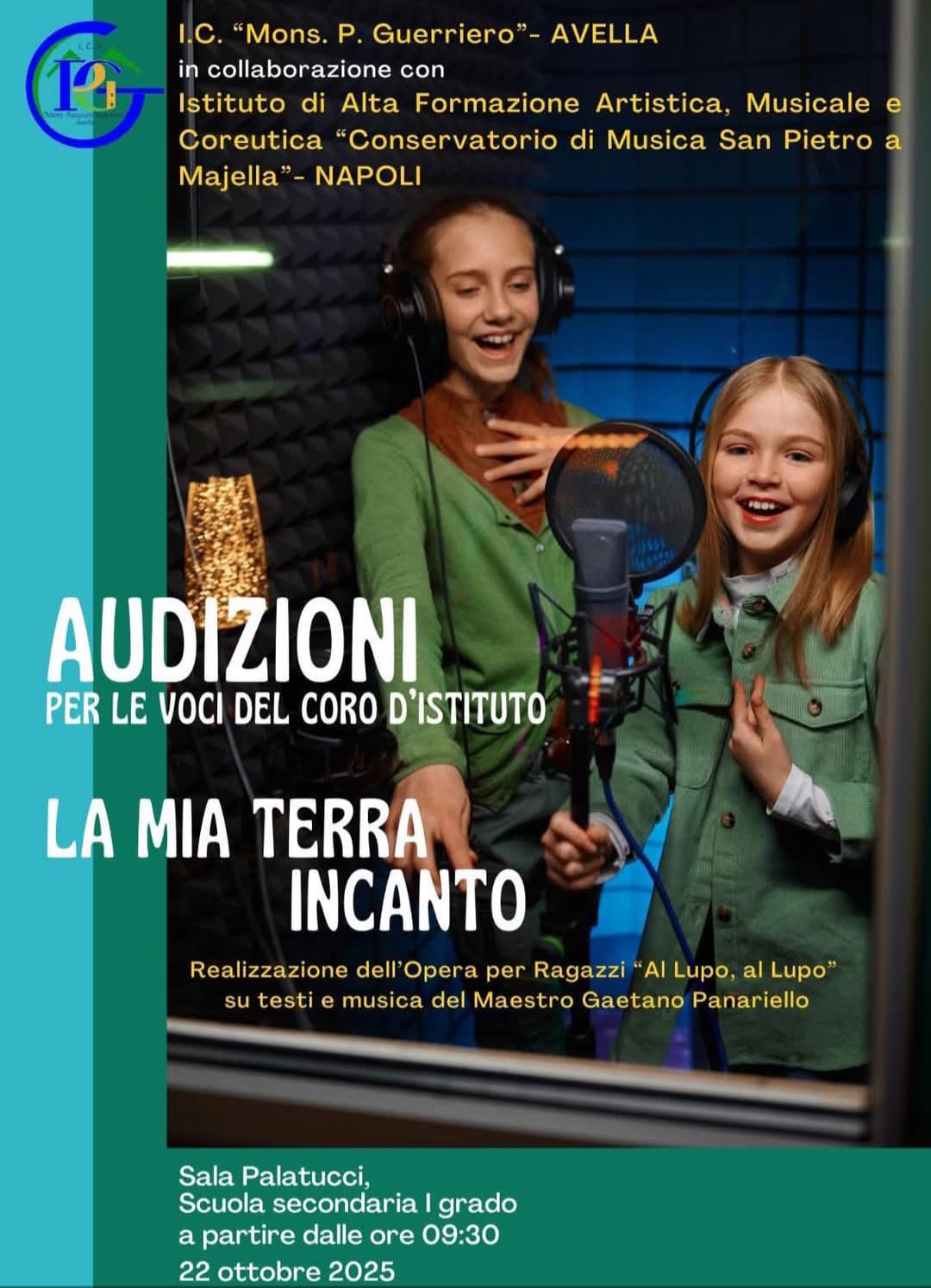 Si sono concluse ieri, 31 ottobre 2025, nella Sala Palatucci della Scuola Secondaria di I grado dell’I.C.S. Mons.P.Guerriero di Avella, le audizioni per individuare le voci destinate all’esecuzione dell’Opera “Al lupo al lupo” su testi e musica del M° Gaetano Panariello. L’attività si inserisce nell’ambito del Protocollo d’Intesa che l’Istituto scolastico avellano ha stretto con il Conservatorio di Musica San Pietro a Majella di Napoli, storico e prestigioso Ente di Alta Formazione Artistica e Musicale. Per 16 bambini, selezionati su circa 50 candidati tra le classi quarte, quinte della Scuola Primaria e tra le classi prime e seconde della Scuola Secondaria di I grado, si avvia ora un percorso che condurrà alla creazione del Coro d’Istituto che sarà protagonista della realizzazione dell’opera, con due esibizioni aperte al pubblico: il 22 dicembre 2025, nella Sala Scarlatti di Napoli, con l’ensemble strumentale del Conservatorio e nella primavera 2026, in un Sito archeologico nel Comune di Avella.