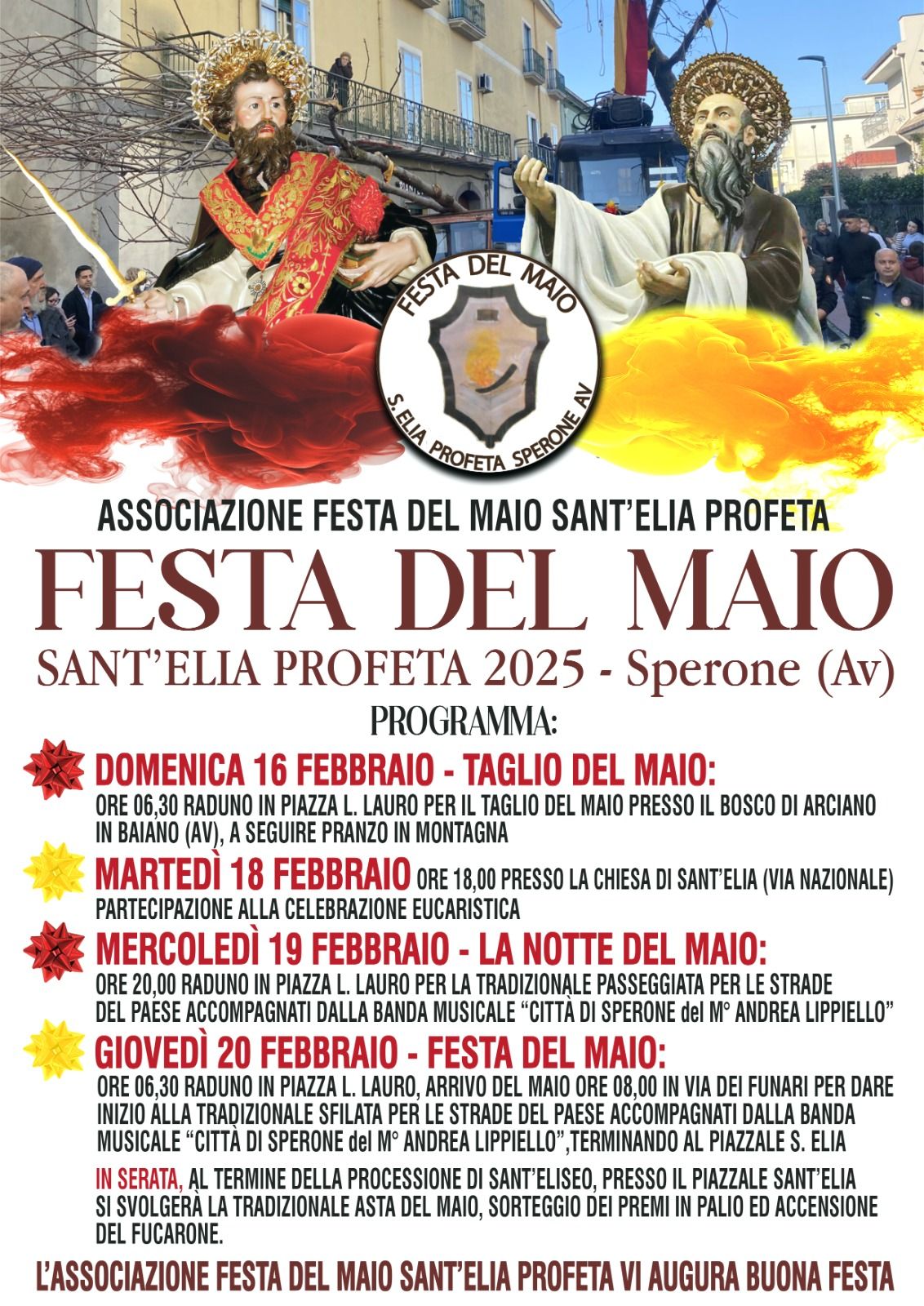 Alle ore 20:00, Piazza L. Lauro sarà il punto di ritrovo per la passeggiata per le strade del paese, accompagnata dalle note della banda musicale “Città di Sperone” diretta dal M° Andrea Lippiello. Un’occasione per respirare l’atmosfera festosa e prepararsi al giorno principale della celebrazione. - Giovedì 20 febbraio – Festa del Maio