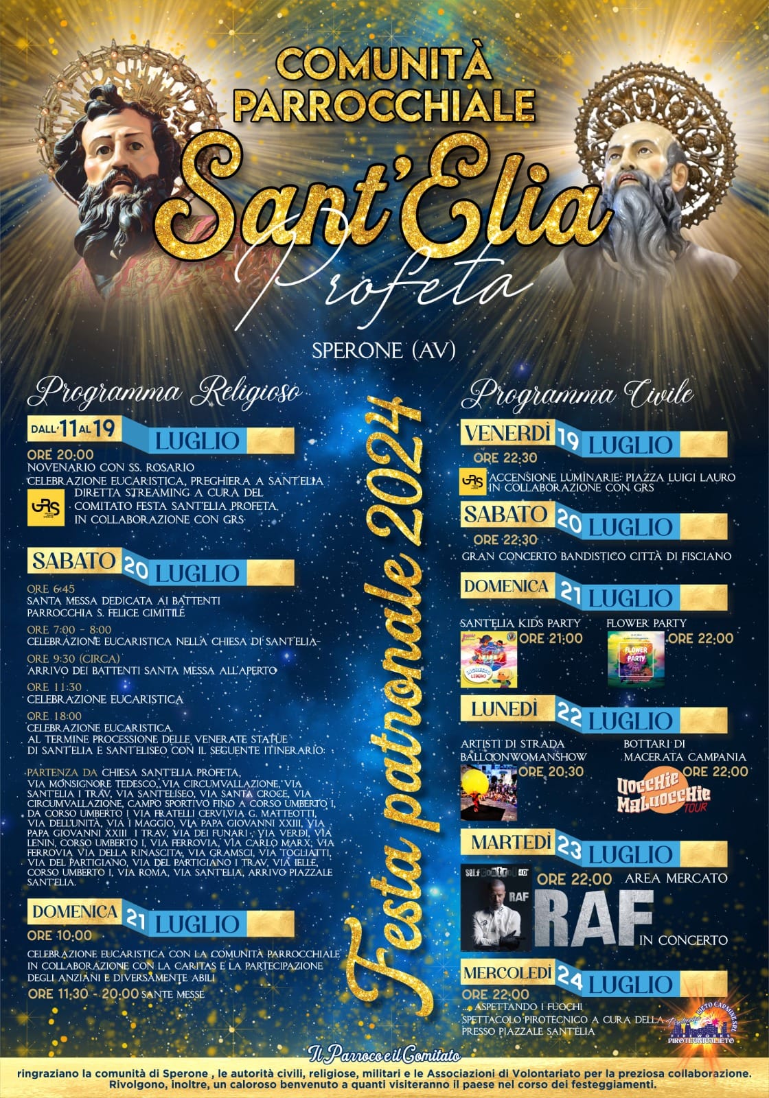 Sperone si prepara a celebrare la tradizionale festa patronale in onore di Sant’Elia Profeta, in programma per la prossima settimana. Il Comitato Festa ha reso pubblico il programma degli eventi, promettendo giornate ricche di spiritualità, cultura e divertimento per tutta la comunità.