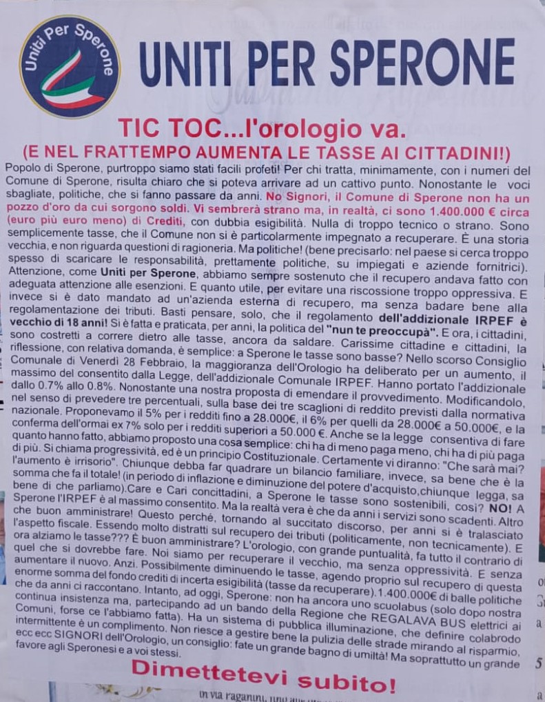 SPERONE – Con un manifesto affisso oggi, il gruppo di minoranza “Uniti per Sperone” accende i riflettori sulla situazione finanziaria del Comune, puntando il dito contro l’amministrazione in carica e lanciando un messaggio diretto: “Tic Toc… l’orologio va. E nel frattempo aumenta le tasse ai cittadini!”.