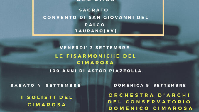 Stamattina si è tenuta la conferenza stampa presso il Conservatorio Domenico Cimarosa di Avellino, per del “Primo Festival Cenacolo delle Musica” che si terrà presso il CONVENTO DI SAN GIOVANNI DEL PALCO IN TAURANO. Una bella opportunità per i giovani musicisti e per l’intero  territorio. Tra l’Associazione dei “I Virtuosi Napoletani” e il Conservatorio “D. Cimarosa” di Avellino è stata firmata una Convenzione- “protocollo d’intesa”- , con l’obiettivo di promuovere i giovani musicisti, l’arte del fare musica e il Territorio del Vallo di Lauro. Il Direttore artistico dell’Evento Massimo Santaniello ringrazia quanto hanno collaborato e contribuito alla nascita del Festival: i Frati minori del Convento di San Giovanni del Palco, l’Amministrazione del Comune di Taurano nella persona del sindaco Maffettone Salvatore, Il Direttore del Conservatorio D. Cimarosa di Avellino Maria Gabriella della Sala e il Presidente Achille Mottola. Tutti gli eventi inizieranno alle ore 21.00 con obbligo della mascherina. L’ingresso è gratuito fino ad esaurimento posti. Nella locandina troverete tutte le informazioni e gli artisti per ogni singola serata.TAURANO. Il Cenacolo della musica festival, dal 3 settembre presso il Convento di San Giovanni del Palco